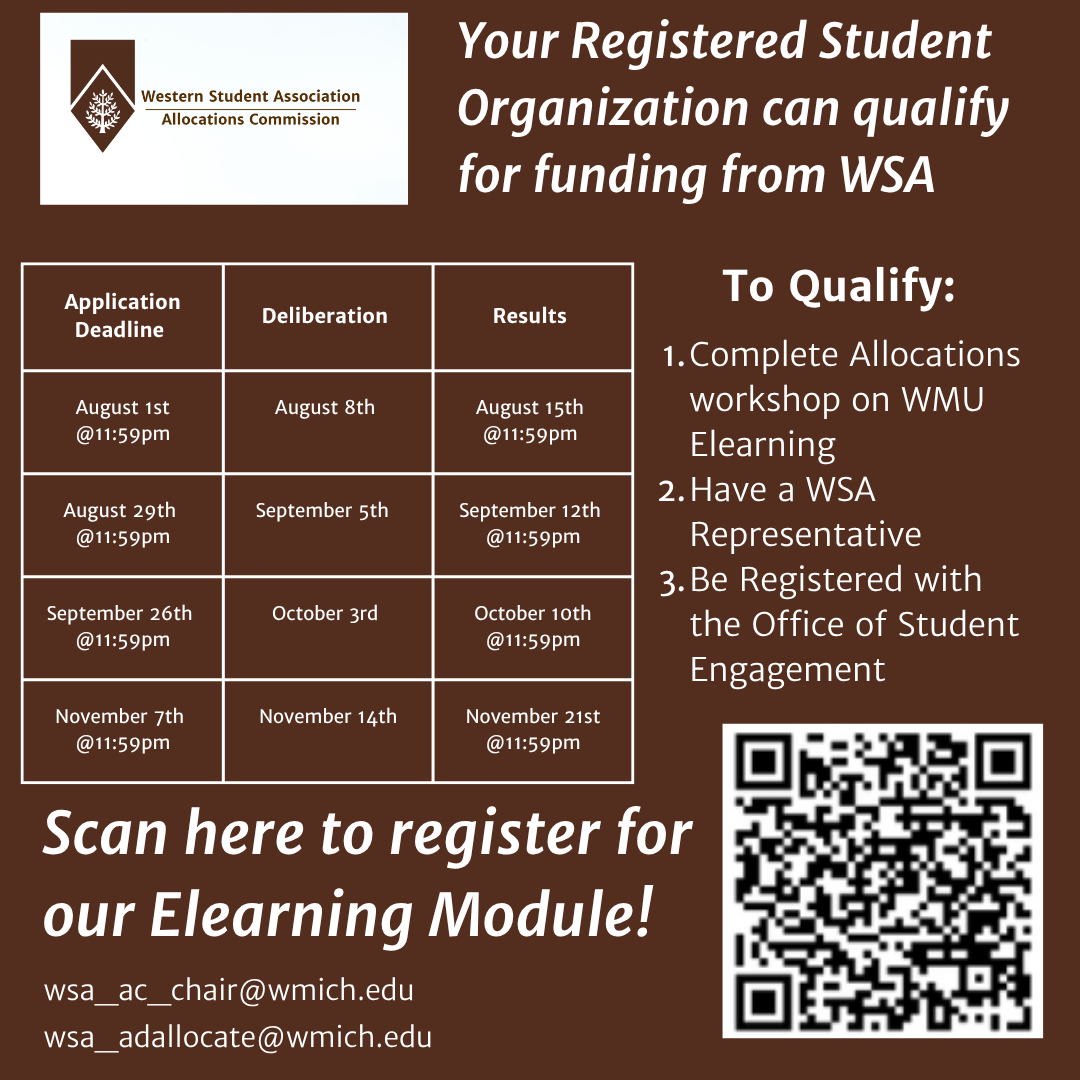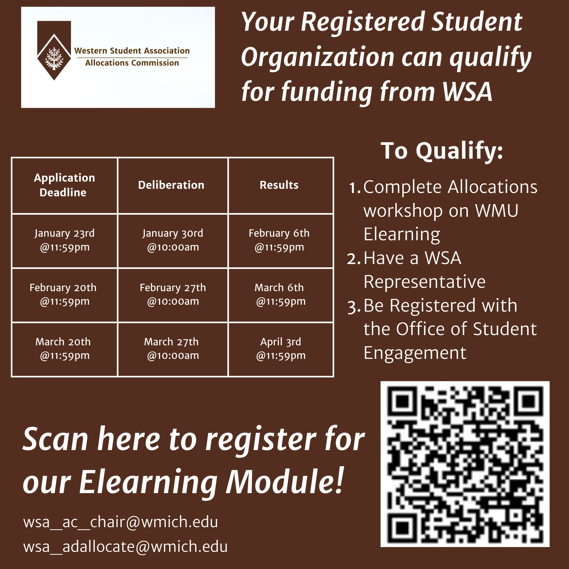 The Western Student Association Allocations Commission (WSAAC) is an integral body of the Western Student Association. We strive to support campus engagement and activities by allocating a portion of the the funds collected through the Student Assessment Fee to qualified RSOs through the evauation and fulflilment of funding proposals and efficient completion the allocations process.