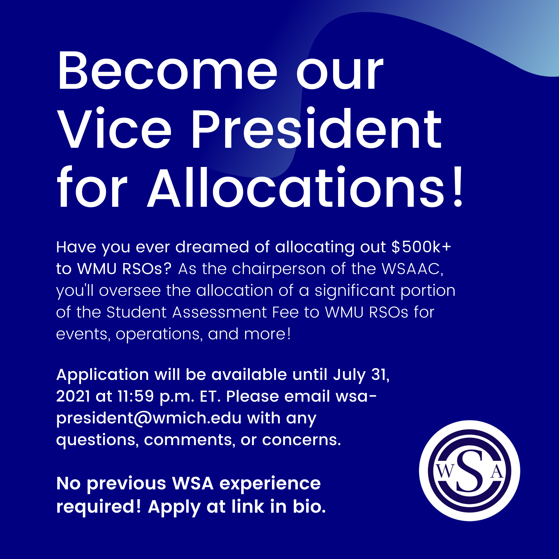 Seeking students for WSA Cabinet position. Have you ever dreamed of allocating out $500k+ to WMU RSOs? The VP for Allocations will oversee the allocation of a significant portion of the Student Assessment Fee to WMU RSOs for events, operations, and more! Paid position. No prior WSA experience is needed.
